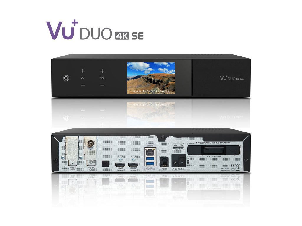 Vu + DUO 4K SE ve verzi s 1x duálním pozemním DVB-T2 MTSIF tunerem (možnost nahrávát a sedovat až ze 2 multiplexů). Dále obsahuje zabudovanou čtečku karet a dva CI sloty pro vložení přístupového dekódovacího modulu. Přijímač využívá nejvýkonnější čtyřjádrový procesor v modelech Vu + s frekvencí 1,5 GHz doplněný o operační paměť 3GB LPDDR4 a flash paměť 4GB eMMC. Pro nahrávání máte možnost vložení pevného disku 2,5 "s max. kapacitou do 4TB ve vyměnitelných šuplíku, který se nachází na zadní straně přijímače. Možnost osazení až dvou vyměnitelných FBC tunerů (slot A - osazen satelitním FBC tunerem, slot B - volný slot pro další FBC tuner). Pro připojení k internetové síti má přijímač zabudovaný gigabitový ethernet, také je možné jej připojit k internetu pomocí zabudované WiFi. Přijímač disponuje i vestavěným Bluetooth adaptérem, jehož využití je na Bluetooth dálkové ovládání nebo připojení Bluetooth Audio zařízení. Kromě HDMI 2.0 výstupu má přijímač i HDMI IN konektor pro připojení externího zařízení s HDMI připojením (XBOX ONE, PS4, DVD apod.). K připojení USB komponent má Vu + DUO 4K SE zabudované dva vysokorychlostní USB porty 3.0 a jeden 2.0 USB port. Podpora pro obraz v obraze - QUAD PIP.